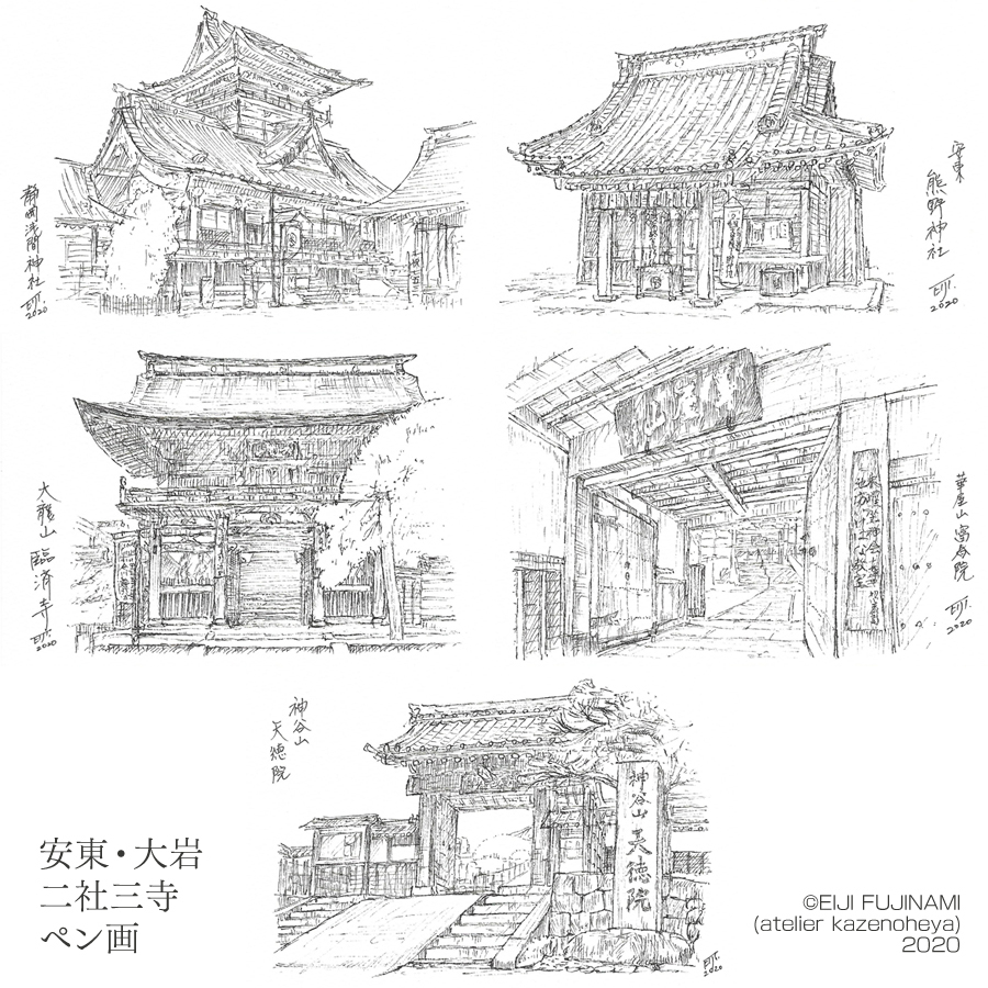 「安東・大岩 二社三寺 ペン画」2020